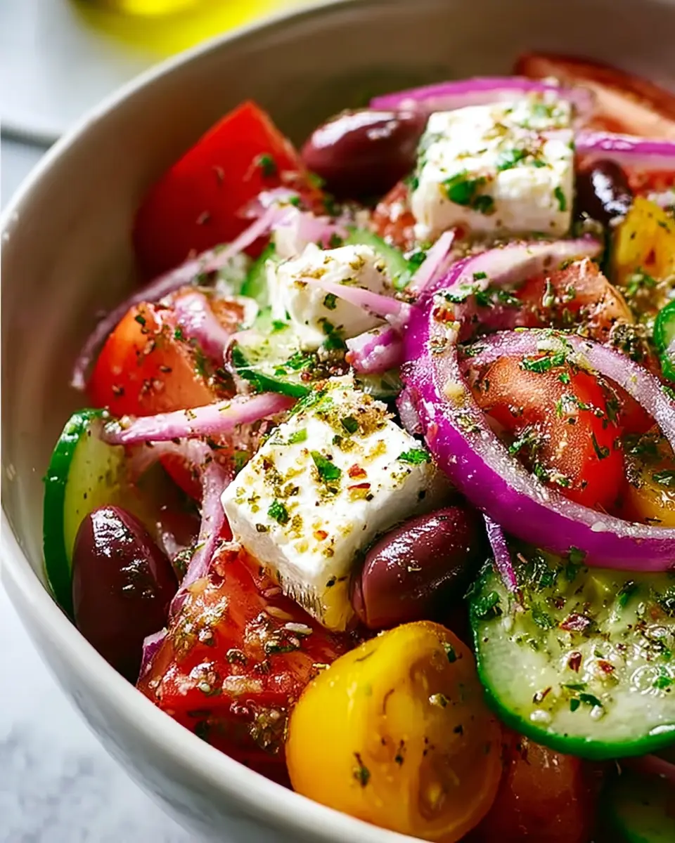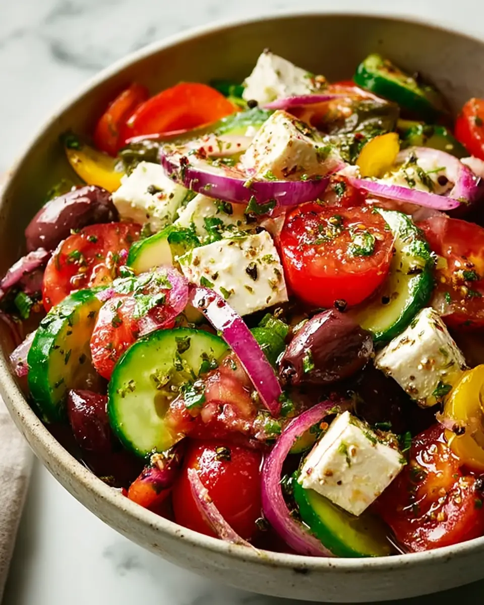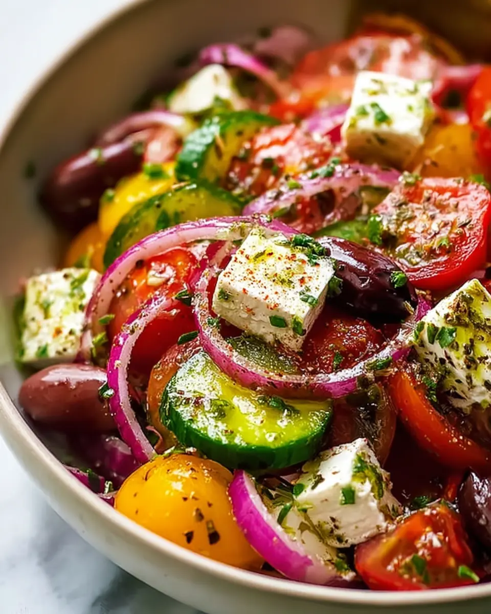 In summary, the Authentic Mediterranean Greek Salad is a delightful dish that captures the essence of fresh Mediterranean flavors. Ideal for busy lifestyles, this vibrant salad is not only quick to prepare but also packed with nutrients. Enjoy this recipe as a healthy lunch, snack, or side dish—your body will thank you!