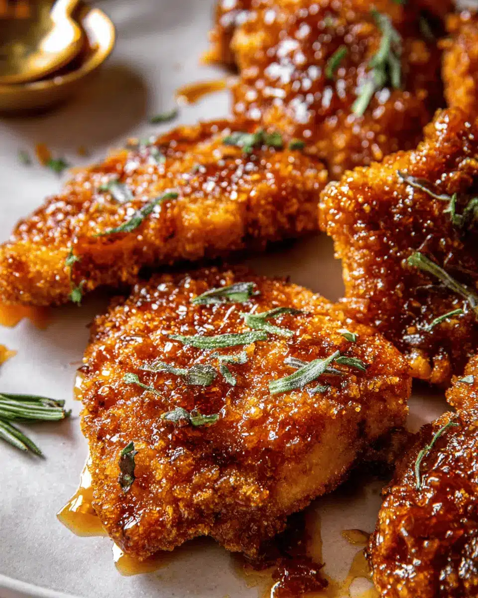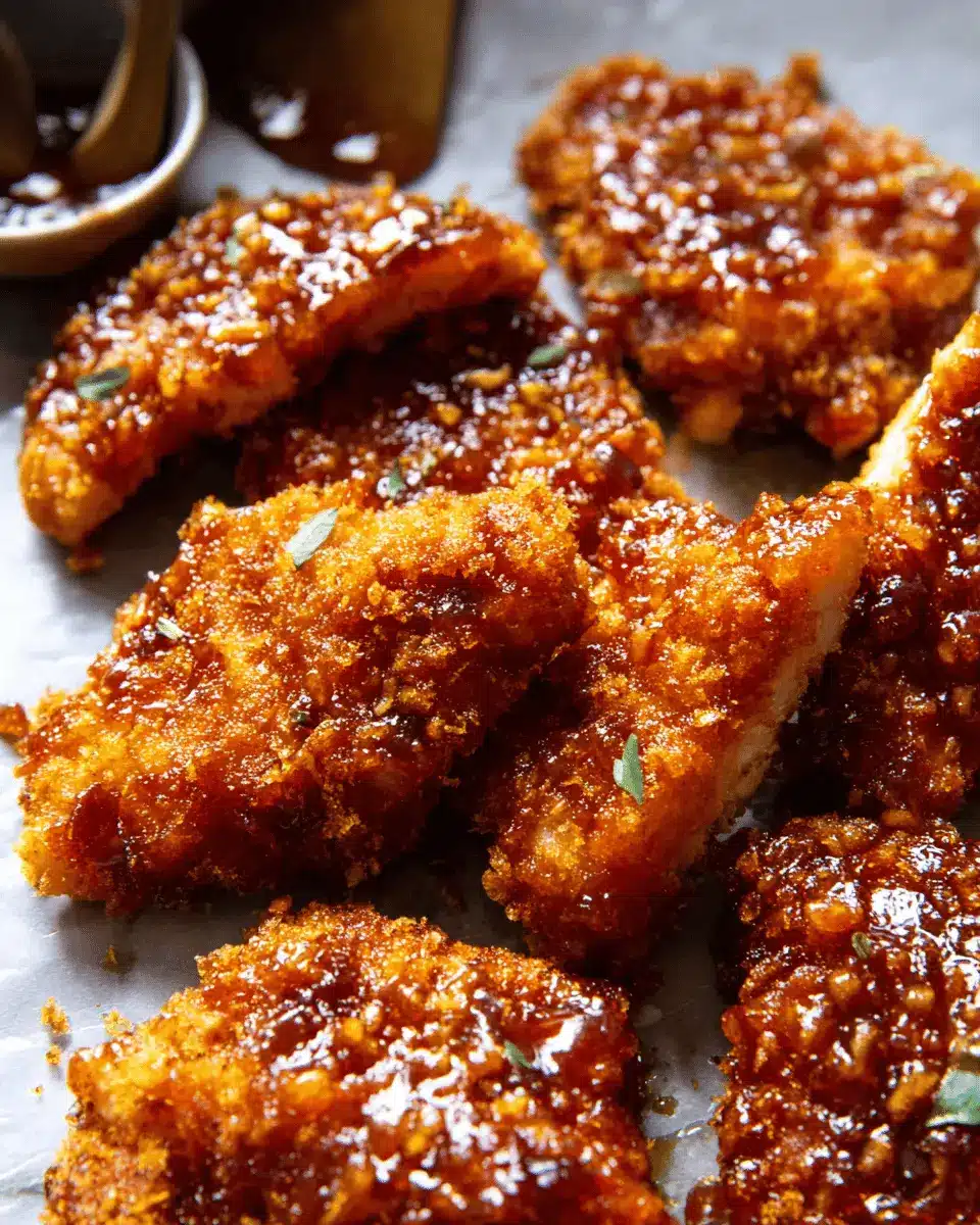 Once the chicken is out of the oven, generously drizzle the warm hot honey sauce over the crispy chicken tenders. For a finishing touch, feel free to garnish with fresh herbs like thyme or parsley. Serve it up with your favorite sides, and watch as everyone digs in!