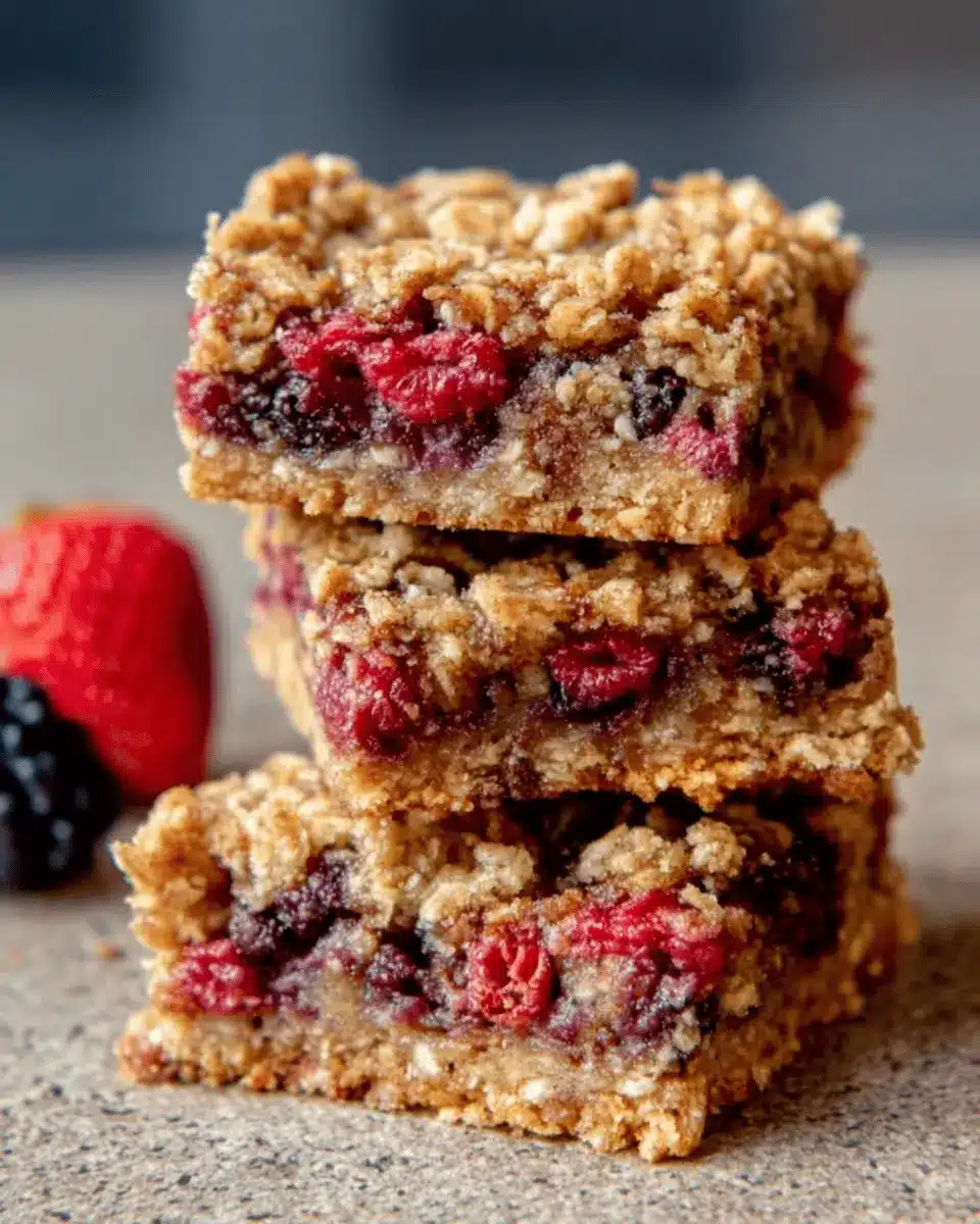 Let’s make these berry oat bars even more appealing! Cut them into neat squares and arrange on a colorful platter, perfect for brunch or a picnic. Drizzle a bit of honey or maple syrup on top to elevate the look (and flavor!). You could even serve them in fun, eco-friendly containers for a grab-and-go snack during busy days. For a cozy evening, warm them slightly and serve with a scoop of vanilla ice cream for a delightful dessert twist. The possibilities are endless!