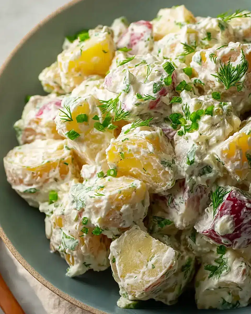 Once your potatoes are cooked and drained, it’s time to combine everything! Spread the warm potatoes on a sheet pan and let them cool for about 10-15 minutes. This step is essential; you don’t want the heat from the potatoes to curdle the yogurt dressing. When ready, transfer the cooled potatoes to a large mixing bowl and toss in freshly sliced scallions, minced chives, garlic powder, and a dash more salt. Pour your prepared dressing over the top, and then with a gentle hand, fold everything together. Use a spatula or wooden spoon to ensure all the ingredients are evenly coated—just enough to avoid a gummy texture.