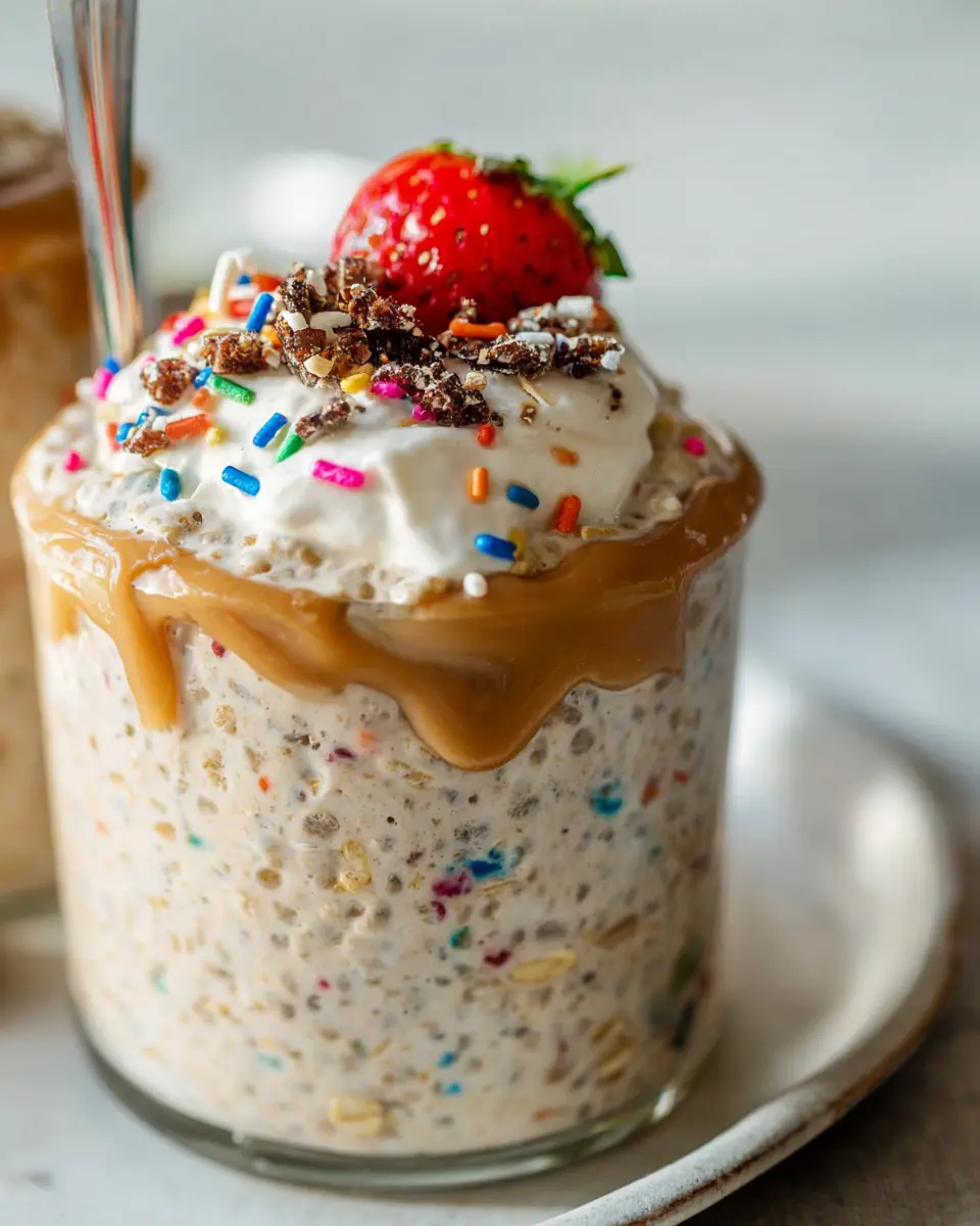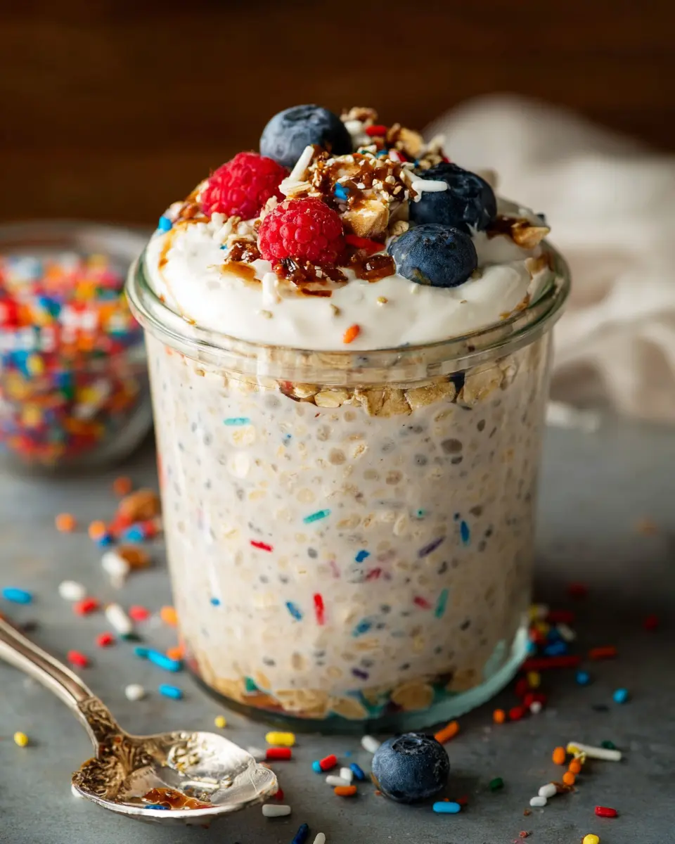 To take your birthday cake overnight oats to the next level, consider adding some delightful toppings. Here are a few suggestions: