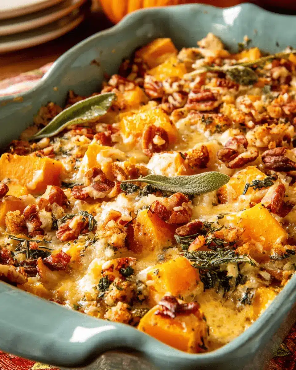 Presentation can wow your guests! Serve the casserole in small, individual ramekins for an upscale feel or in a large, colorful baking dish at the center of the table. Garnish with fresh sage and thyme leaves to add visual appeal while enhancing flavor. A sprinkle of pomegranate seeds can also introduce a pop of color and a hint of sweetness.