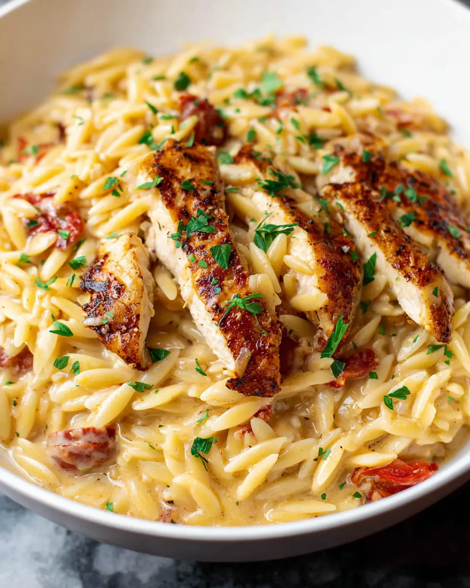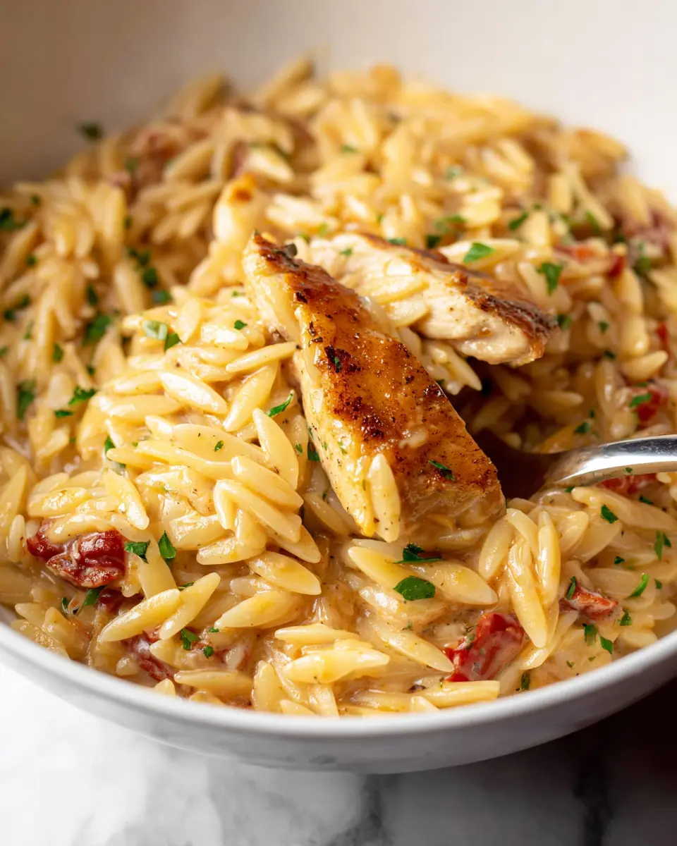 After incorporating the chicken and cheese, remove the pot from the heat, cover it, and let it sit for about 3-5 minutes. This resting period allows the orzo to absorb the remaining liquid, thickening the dish beautifully.