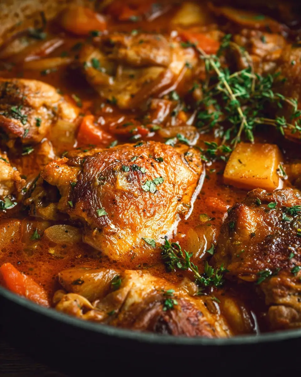 After baking, remove the pot and uncover it to add in halved baby potatoes. Push them into the sauce and reposition the chicken to maintain its crispy skin. Bake uncovered for an additional 40 minutes. Finally, taste and adjust the seasoning before serving. Garnish your stew with fresh thyme or parsley for a pop of color and freshness, and don't forget the crusty bread for a perfect dunking experience!