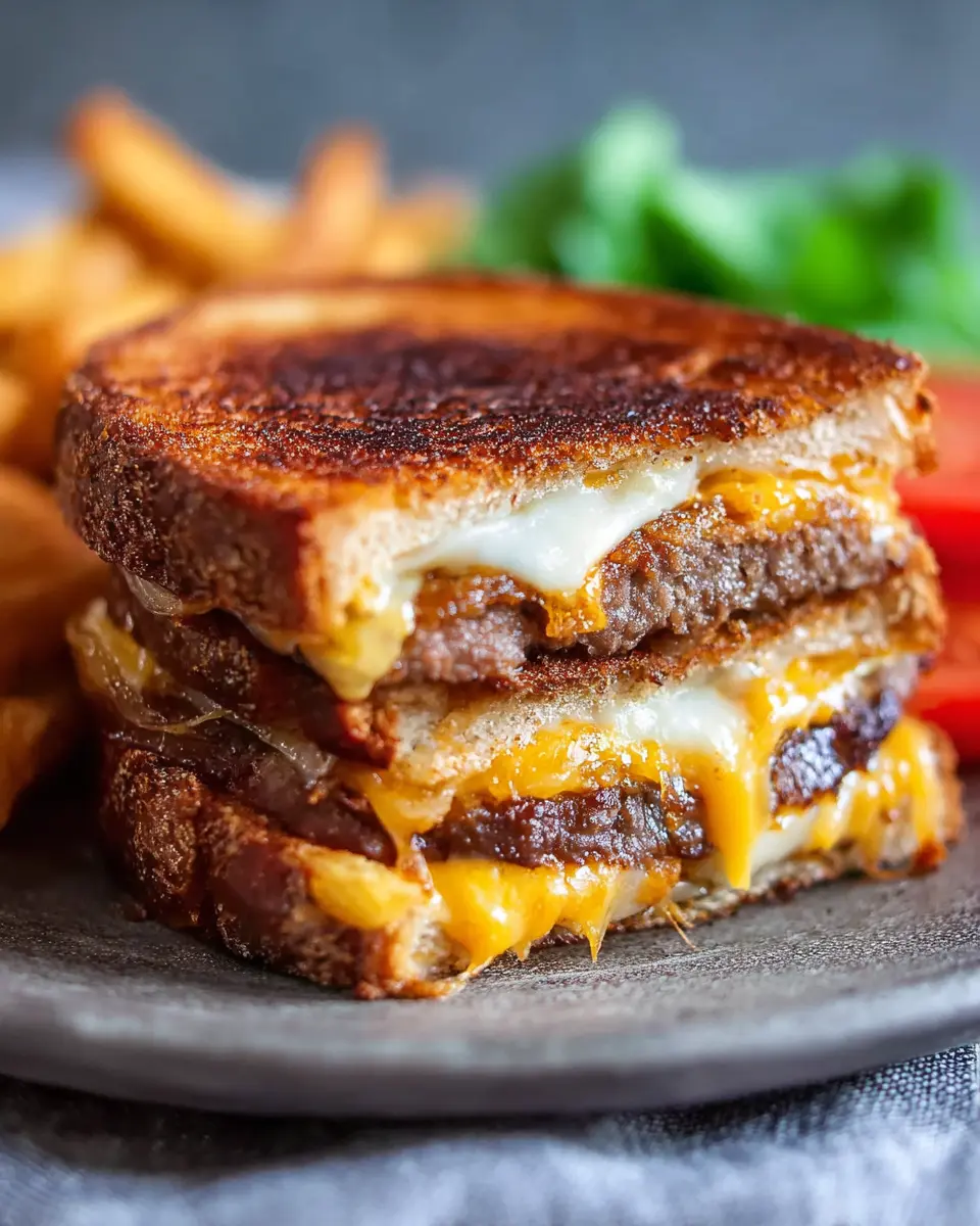 A classic patty melt is a mouthwatering sandwich that combines the best elements of a hamburger and a grilled cheese, all in one delicious package. At its heart, you have a juicy beef patty, grilled to perfection, nestled between slices of buttery, golden-brown rye bread. Add in caramelized onions and melty sharp Cheddar cheese, and you have a flavor explosion that is simply irresistible.