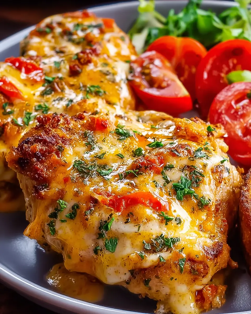 - In a large oven-safe skillet, heat olive oil over medium-high heat. Add the chicken breasts and sear for 5-6 minutes on each side until golden brown. Remove from the skillet and set aside.
