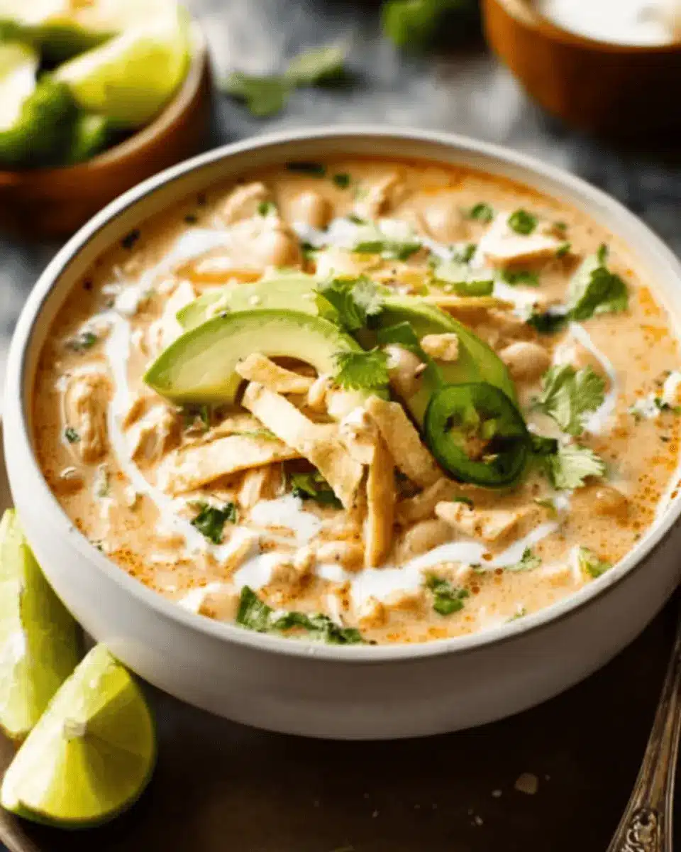 Now, ladle your creamy white chicken chili into bowls and personalize each serving with toppings like avocado, yogurt or sour cream, and a drizzle of lime juice. Enjoy the cozy, comforting goodness you've created!