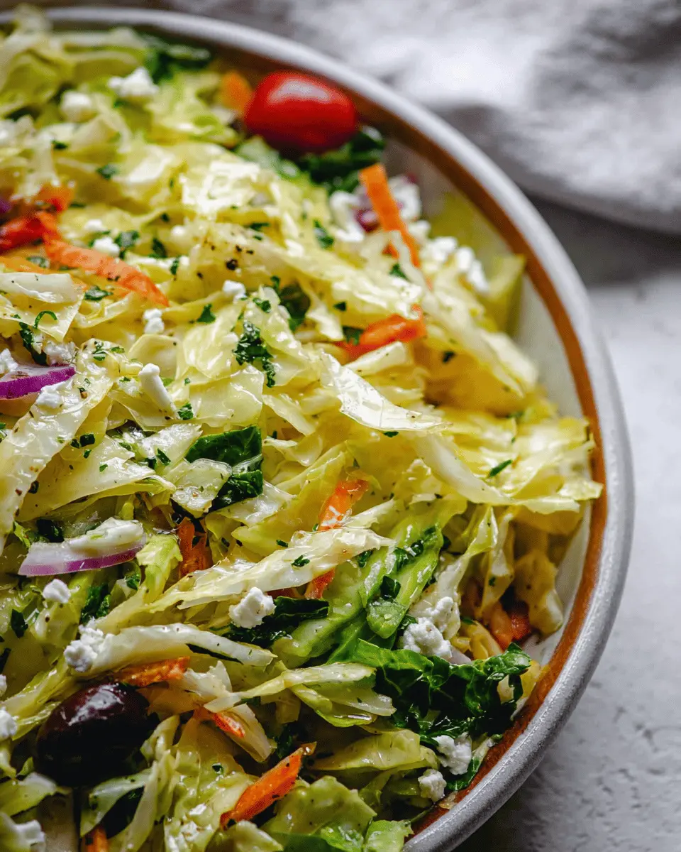 From start to finish, including letting the flavors mingle, your Greek Cabbage Salad will be ready in 45 minutes. Perfect for a refreshing meal or side dish that's packed with flavor and crunch!