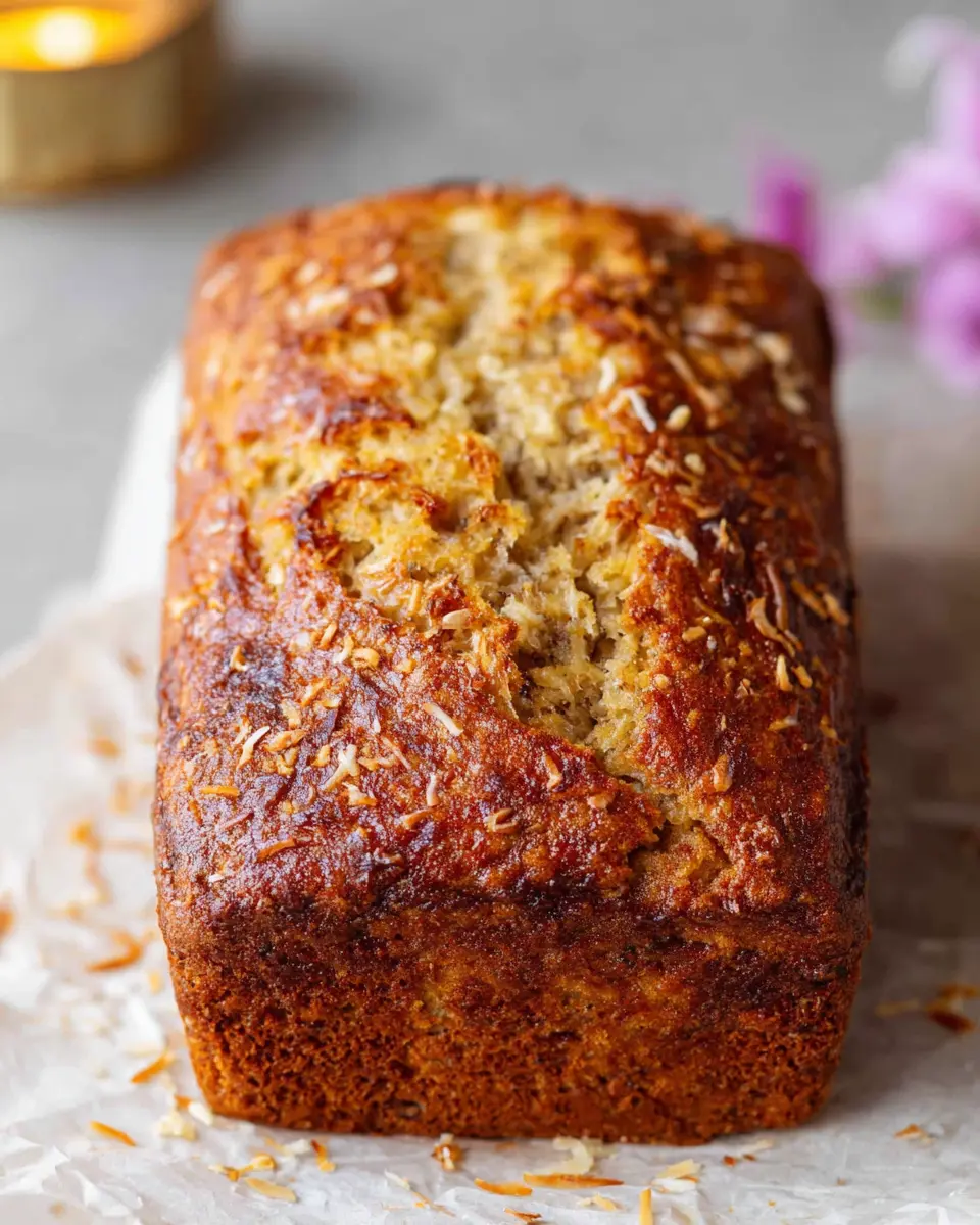 Pour your batter into a greased 8"x4" loaf pan. Optionally, sprinkle a bit more shredded coconut on top for extra texture. Bake in your preheated oven for 40-45 minutes, or until the top is golden brown and a skewer inserted into the center comes out clean. After baking, let it cool in the pan for about 10-15 minutes before transferring it to a cooling rack.