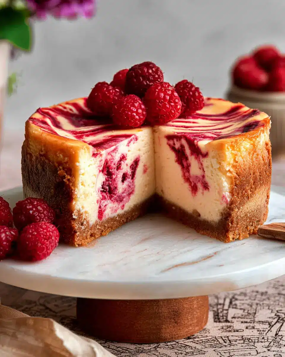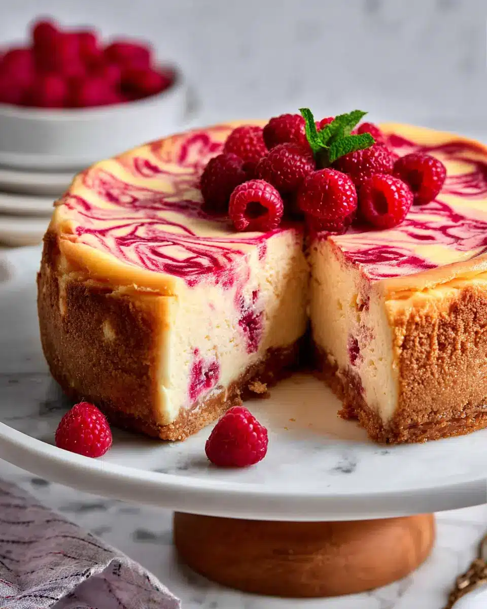 To wow your guests, presentation is key! Serve your cheesecake on a beautiful cake stand or a rustic wooden board. Garnish each slice with a few whole raspberries and a sprig of mint for that pop of color. Using the reserved raspberry sauce, create an artistic drizzle on the plate for an elegant touch. And don’t forget to serve coffee or herbal tea alongside for the perfect finishing touch to your dessert experience!