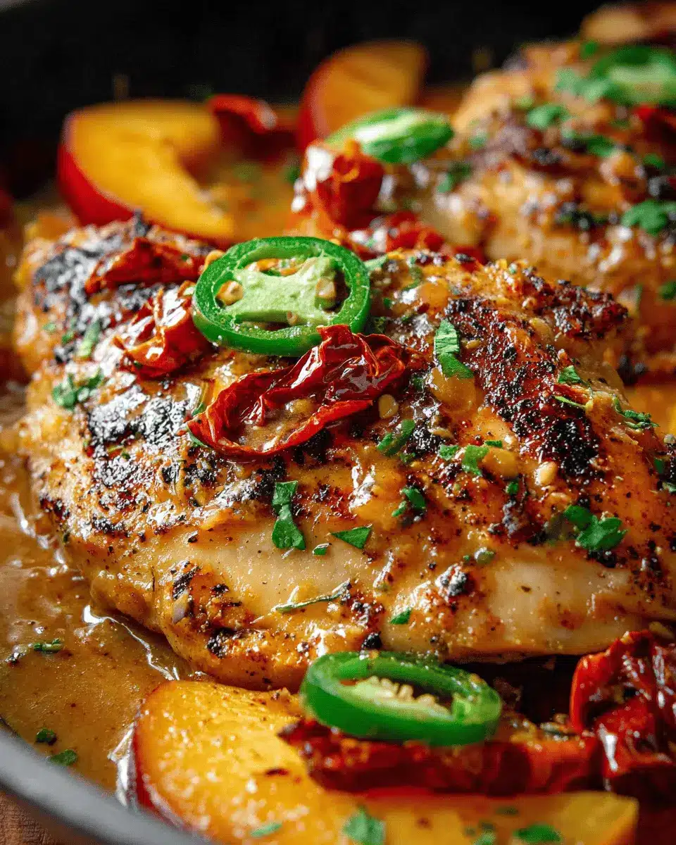 - Do not remove the chicken. Add peach and jalapeño sauce to the same skillet and cook for 3 more minutes.