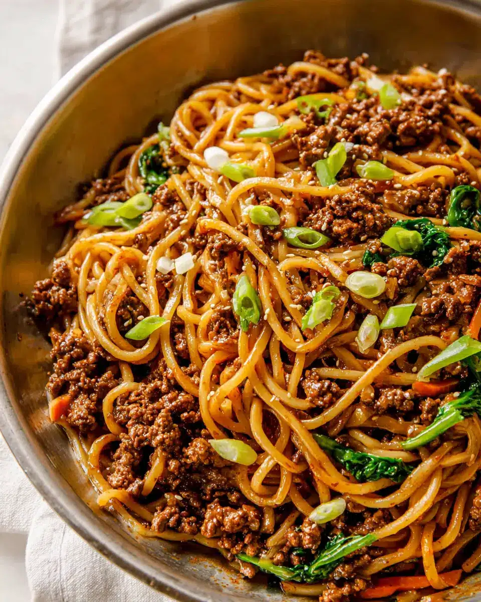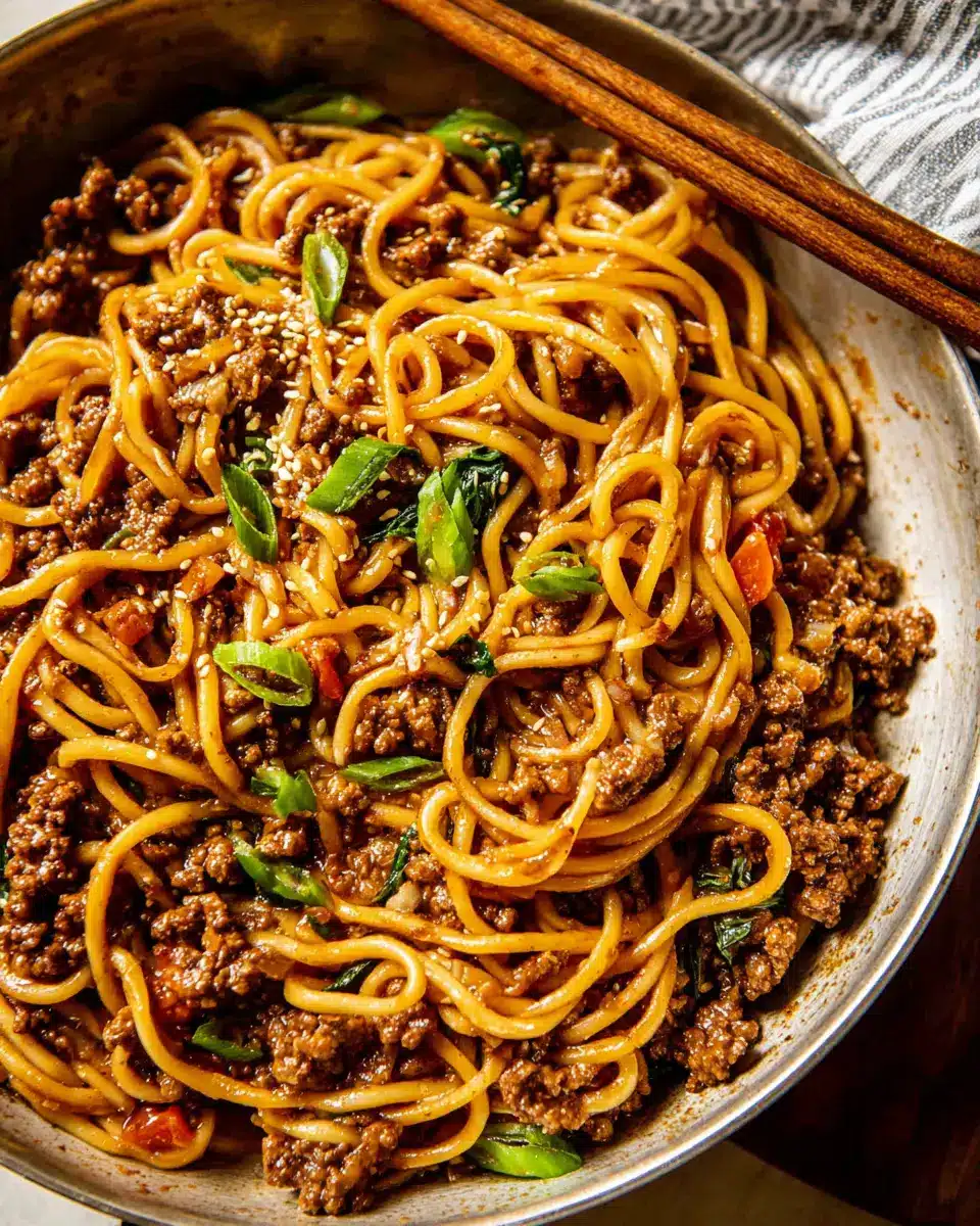Transform your Mongolian Ground Beef Noodles into a culinary masterpiece by plating it artfully. Start by twirling the noodles into a nest-like shape atop the plate. Drizzle the savory sauce around the edges for a splash of color. Garnish generously with sliced green onions and white sesame seeds for that pop of freshness. For an extra touch, consider serving your noodles in rustic bowls or alongside decorative chopsticks to create an inviting atmosphere.
