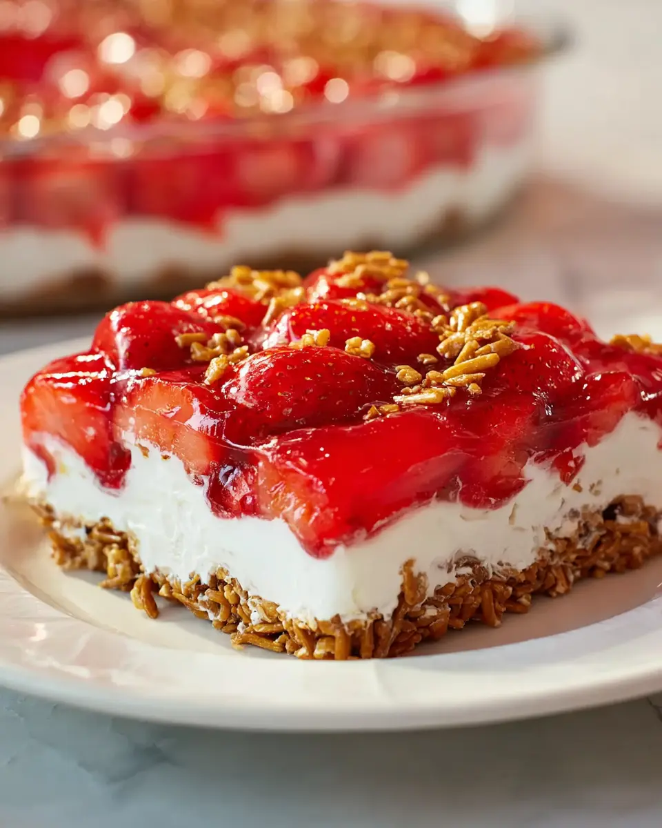 Finally, refrigerate your strawberry pretzel salad for at least 2 hours, allowing all those flavors to marry beautifully. When you're ready to serve, cut it into squares and watch your friends and family admire your creation. Trust me, this dish will be the highlight of any meal!