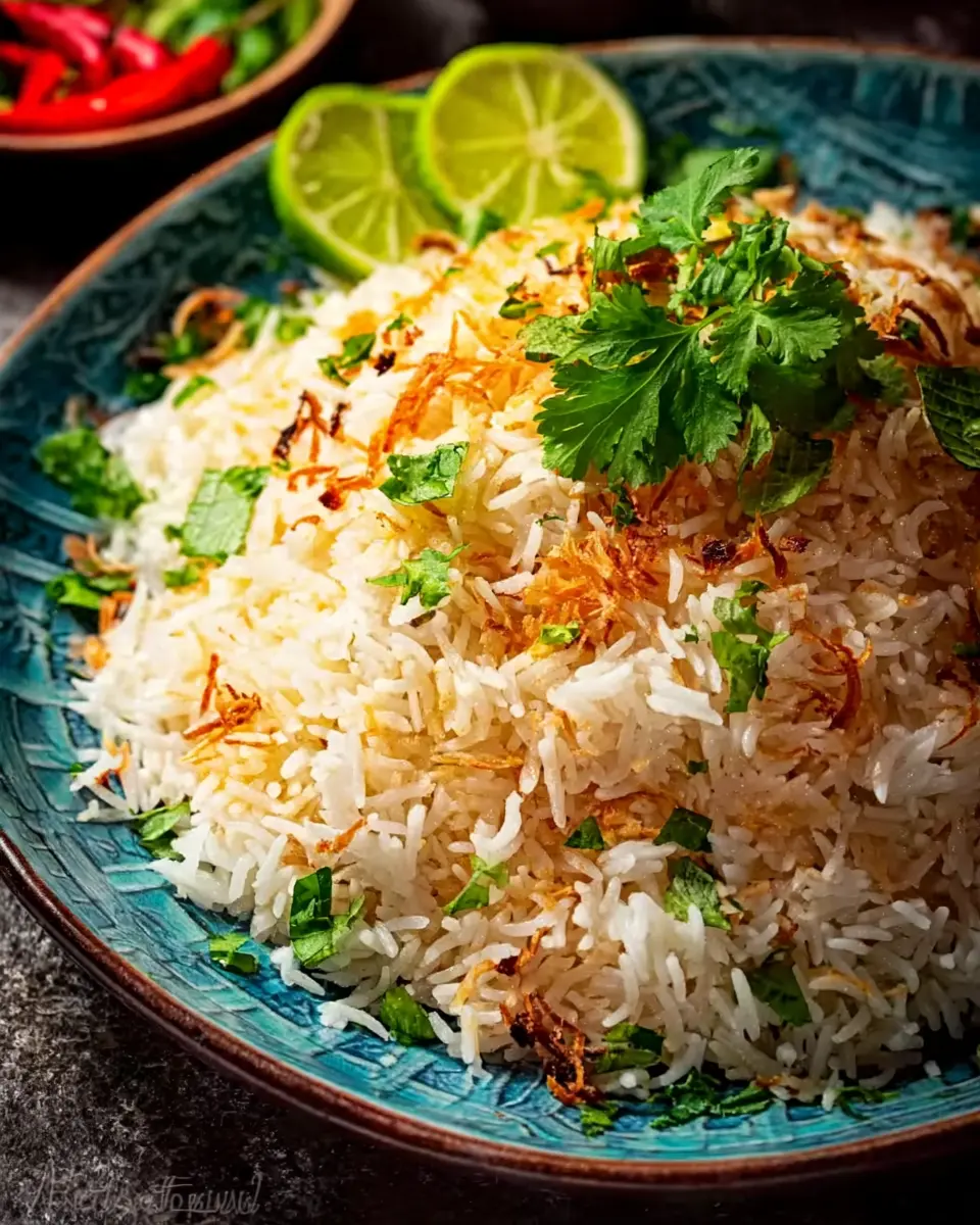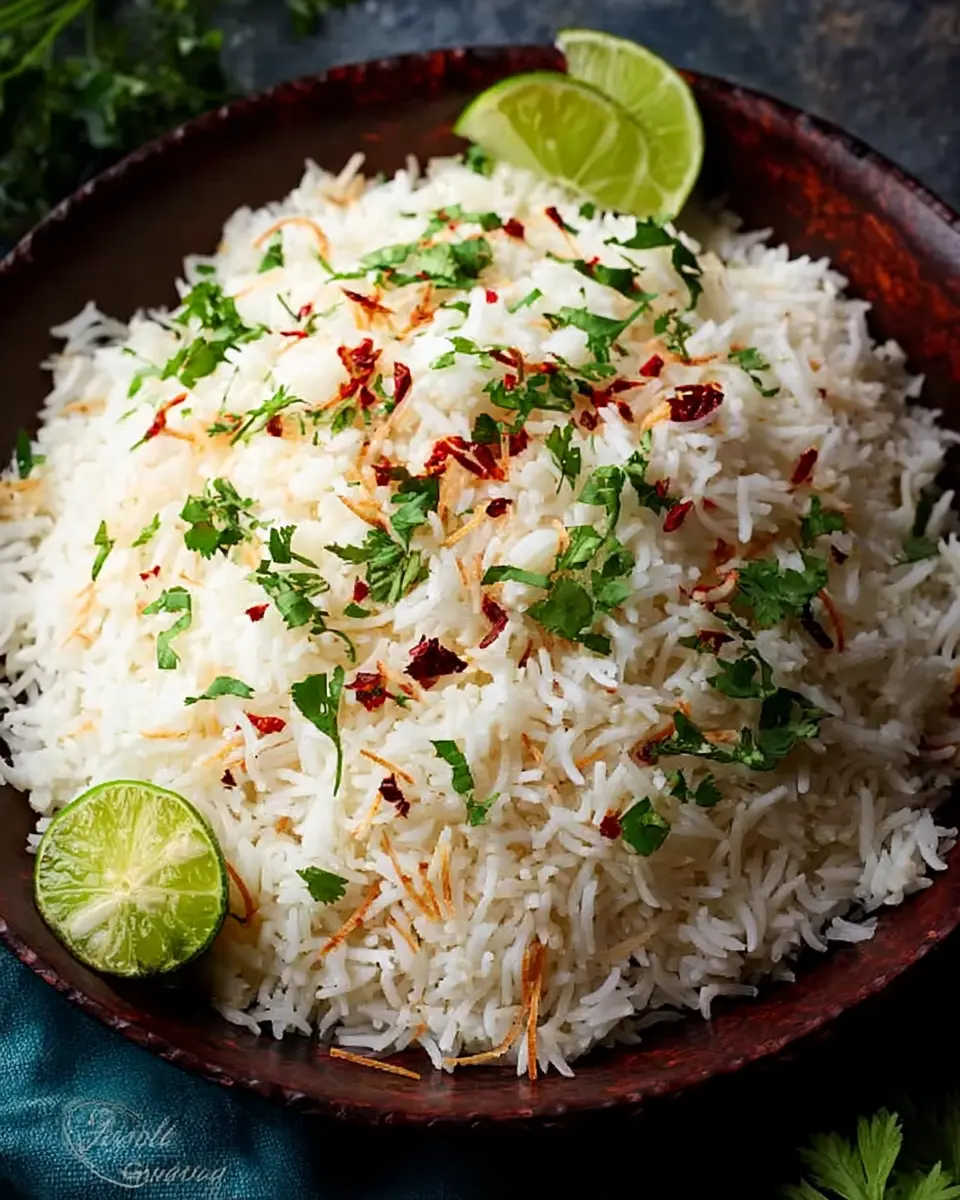 - Fluff the rice with a fork, garnish with chopped cilantro or parsley, and serve with lime wedges if desired.